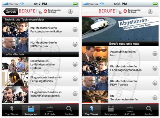 Eine App der Bundesagentur für Arbeit kann durchaus unterhaltsam sein. In rund 200 Filmen werden in dieser App, die es als Berufe.tv für iPhone und iPod Touch und als Berufe.tv HD für das iPad gibt, alle möglichen Berufe vorgestellt. Die Berufe sind in zwanzig Kategorien unterteilt, so dass die Suche etwas einfacher ist. Natürlich sind die Filme zur Berufsorientierung gedacht, aber man kann sie sich auch ansehen, wenn man bereits mitten in der Arbeitswelt angekommen ist.