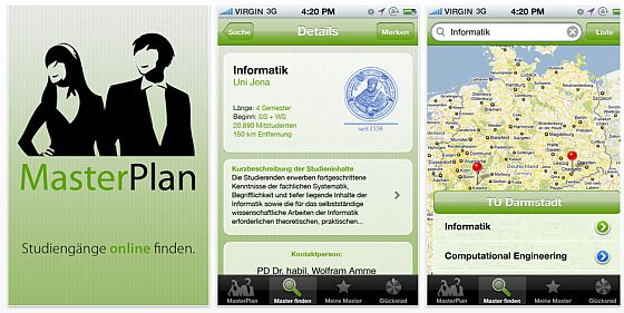 Die App MasterPlan ist die erste mobile Studiengangsuche für Dein iPhone und ist die mobile Variante von MasterPlan.info. Mit MasterPlan kannst du nach Masterstudiengängen in Deutschland suchen. Dazu gibt man das Fach ein, in dem man einen Mastertitel erwerben möchte. Die Suche schlägt nach Eingabe der ersten Buchstaben bereits passende Suchbegriffe vor.   Die gefundenen Programme werden als Liste oder auf einer Karte angezeigt. Zu jedem Studiengang gibt es eine detaillierte Beschreibung mit Studieninhalten, Zielgruppe und Zulassungsvoraussetzungen.
