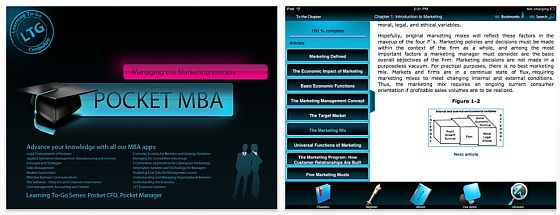 Von 11,99 Euro auf vorübergehend kostenlos hat Intersog den Marketingkurs Pocket MBA: Managing the Marketing Process für das iPad gesetzt. In diesem englischsprachigen Lehrgang erfahrt Ihr in 24 Kapiteln, was Ihr im Bereich Marketing für den MBA braucht. Das ist also keine leichte Kost, auf dem iPad aber gut durchzuarbeiten. Für alle, die im Marketing arbeiten, ist die App sicher sehr wertvoll. Der Stoff ist recht umfangreich, die App bietet auch Grafiken und tabellen zur leichteren Übersicht. Nach jedem Kapitel gibt es einen kleinen Test, mit dem Ihr überprüfen könnt, ob Ihr das Kapitel verstanden habt.
