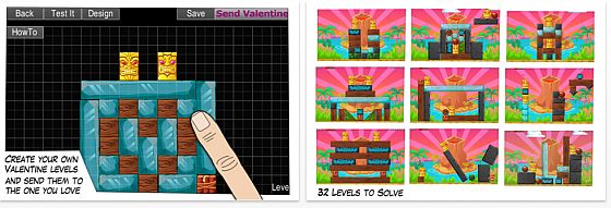 Integriert ist auch ein Level-Builder, mit dem man eigene Level erstellen kann, die man dann entweder selbst spielt, oder an andere Spieler mit einem Valentinsgruß versenden kann. Um einen selbst gestalteten Level speichern und versenden zu können, muss man ihn zuerst einmal selbst schaffen. So wird verhindert, dass man unlösbare Level verschickt und beim Empfänger Verzweiflung auslöst.
