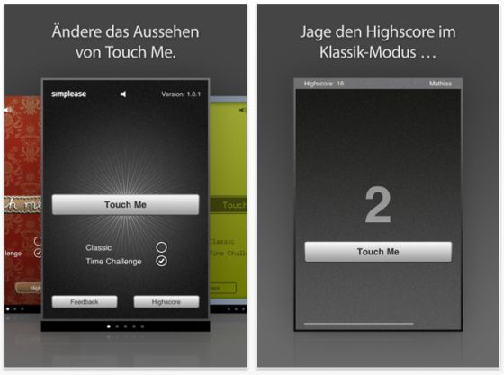 Nun gibt es Touch me auch in einer Pro-Version, die normal 79 Cent kostet, aber heute kostenlos angeboten wird. Touch Me PRO kommt mit 5 verschiedenen, auswählbaren Designs. Dazu kannst Du Dich in einer Time-Challenge mit Deinen Freunden darin messen, wer die meisten richtigen Tipper schafft. Hier kommt es dann nur auf das richtige Zielen mit dem Finger an. Die App ist mit dem Game-Center verbunden, so dass dort die Statistik für Dich vorgehalten wird.
