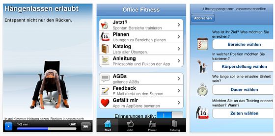 Office-Fit ist eine attraktive App mit über 60 Übungen und erweiterten Funktionen wie das individuell einstellbare Erinnern an Trainings-Zeiten, iPhone 4 Support und vielem Mehr.