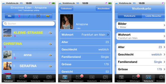 Das Chatten mit dem Edencity Chat ist auf iPhone und iPod Touch (über WLAN) sehr einfach. Links sieht man die Liste der Teilnehmer mit den oben möglichen Sortiermöglichkeiten. In der Mitte ein Beispielprofil mit Bild, einigen Daten. Rechts das eigene Profil zum Einstellen.
