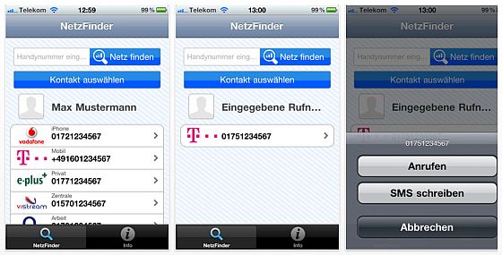 Hier hilft die gerade kostenlose App NetzFinder. Die App überprüft live, in welchem Mobilfunknetz eine Handynummer gerade registriert ist. Und das ist für alle, deren Flatrate nur das eigene Mobilfunknetz abdeckt, eine wertvolle Information. Man kann entweder eine beliebige Rufnummer zur Überprüfung eingeben oder wahlweise einen Kontakt aus dem Adressbuch auswählen. Es werden dann sämtliche Nummern des gewählten Kontaktes überprüft. So sieht man innerhalb weniger Sekunden, in welchem Netz der Kontakt sein Mobiltelefon betreibt und kann die Kosten für einen Anruf besser abschätzen.