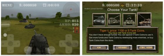 Links siehst Du das Schlachtfeld mit den Bedienelementen. Das linke Kreuzt zum Fahren, das rechte Kreuz bewegt den Geschützturm. In der Mitte schießt Du. Oben rechts siehst Du das Radar, mit dessen Hilfe Du die Position der gegnerischen Panzer sehen kannst. Das rechte Bild zeigt Dir die Panzerauswahl.