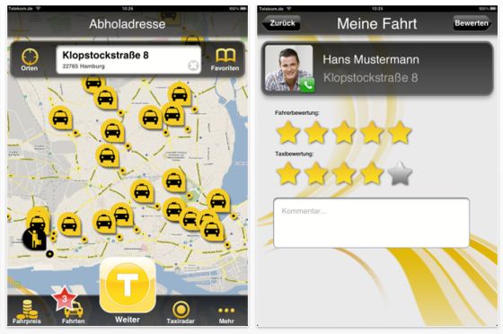 Links siehst Du auf der Karte die aktuelle Position der Taxen, die mit MyTaxi arbeiten, rechts die Bewertungsseite, über die Du den Fahrer bewerten kannst.