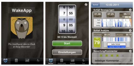 Noch recht neu im AppStore ist der von der AppZoo GmbH herausgegebene Schlafphasenwecker WakeApp. Das ist sozusagen ein besonders schonender und intelligenter Wecker, der Deinen Schlaf analysiert und deine Schlafqualität berechnet. Er weckt dich sanft während einer leichten Schlafphase, was Dir einen optimalen Start in einen erfolgreichen Tag ermöglichen soll. Dazu zeichnet die App die Bewegungen während des Schlafens auf und analysiert daraus die Schlafphase und die Schlafqualität. Beim Einschlafen hilft die App mit Einschlafmusik aus Deiner Musikbibliothek, für das Aufwachen kann man sich verschiedene Sounds aussuchen, die in der App integriert zum Teil ganz witzig sind.