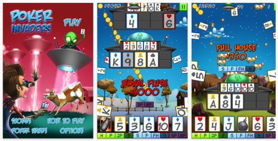 Man darf echt nicht alle Spielideen hinterfragen… Also in der gerade kostenlosen App Poker Invaders geht es darum, dass Aliens mal wieder die Erde angreifen und Du auf einem Bauernhof ganz allein diese Invasion verhindern musst. Dafür stehen Dir nur Pokerkarten zur Verfügung. Und so startest Du den Kampf um das beste Blatt mit den Aliens. Lass Dir einfach zeigen, wie das Spiel funktioniert, es ist einfach zu verstehen, auch wenn die Erklärung wieder mal nur in englischer Sprache vorgenommen wird.