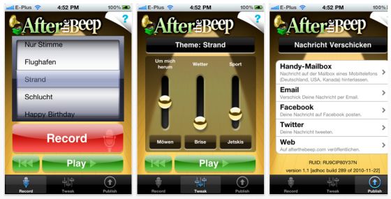 Der Clou ist allerdings, was nach der Aufnahme kommt. After the Beep! bringt bereits von Hause aus 11 professionell aufgezeichnete Klangkulissen mit. Sie erlauben es, die Aufnahme akustisch zu hinterlegen. Auf einmal klingt die Meldung so, als wäre sie am Strand, auf dem Mond, während einer Verfolgungsjagd, auf einem Rockkonzert, in einer Flugzeughalle, in einem U-Boot oder in einer windigen Schlucht aufgenommen worden. Welche Klangkulisse verwendet wird, lässt sich blitzschnell vorgeben.