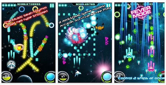 Wenn Du eine ganze Squadron Gegner getroffen hast, fällt ein Sternchen von oben herab, das sollte man einsammeln, weil es den Extralevel öffnet. Dazu gibt es von Zeit zu Teit Bonus-Level, die nicht so einfach sind. So soll man 30 Sekunden in einem Meteoritenhagel überleben, oder 30 Sekunden den scharfkantigen Klingen ausweichen. Dann gibt es noch den Fieber-Modus, wo man gleich zwei unzerstörbare Schiffe steuert und in nur 10 Sekunden so viel Gegner abschießen soll, wie irgend möglich. Der letzte Modius nennt sich Drive Mode, hier hast Du 10 Sekunden, um möglichst viele Würfel zu zerstören.