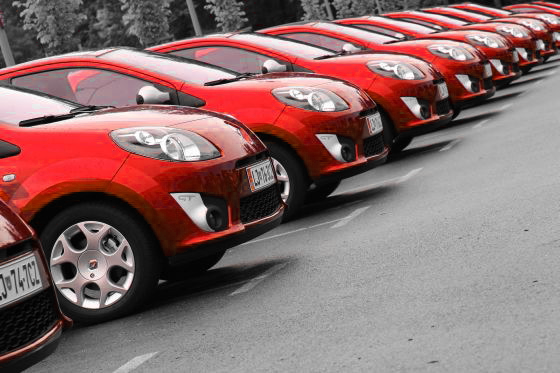 Das ist das Ergebnis, so wie ich es gerade per Mail erhalten habe. Ich habe erst die Farbe blau per Pipette aus dem Bild übernommen, dann das Bild entfärbt (die blauen Autos blieben blau) und dann das Blau durch Rot ersetzt.