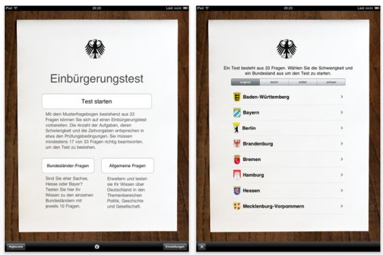 Dennoch kann es nicht schaden, sich mal an dem Einbürgerungstest zu versuchen. Die über Ostern kostenlose iPad-App Einbürgerungstest D-Quiz enthält alle 460 Fragen, die vom Bundesministerium veröffentlicht wurden. Wenn man den Test machen möchte, klickt man auf dem Startbildschirm der App auf Test starten. Auf dem nächsten Bildschirm kann man unter den Bundesländern wählen und den Schwierigkeitsgrad. Am Besten startet man mit „Original“.