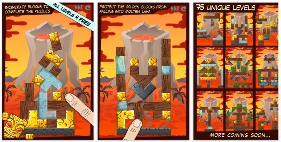Die Spiele der Tiki Totems Reihe hatten wir bereits mehrfach auf app-kostenlos.de. Sie zeichnen sich durch eine intelligente Spielidee aus, die mehrere Stunden fesseln kann. Die Geschichte ist immer ähnlich. Du musst, um die Götter nicht zu erzürnen, vorsichtig Gebilde abbauen und dabei darauf achten, dass bestimmte Blöcke, in dieser Version die goldenen Blöcke, nicht auf den Boden fallen. Im neuen Teil Tiki Lavalanche hat ein Lavastrom das Dorf vernichtet, Du hast aber noch eine Chance die komplette Ausrottung des Dorfes zu verhindern. Dazu brauchst Du einfach nur die 75 Level zu lösen, die das Spiel Dir bietet. Wie immer: Am Anfang ganz leicht, doch dann wird es schwerer…
