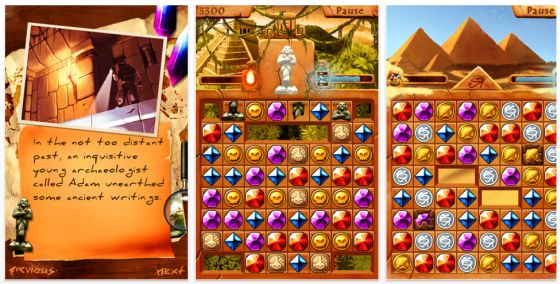 Die Puzzle sind in der bekannten “kombiniere drei Gleiche” Spielweise erstellt. Hier ist aber die Besonderheit, dass auf jedem Spielbrett zwei oder drei Fundstücke vom oberen Rand bis ganz nach unten transportiert werden müssen, indem man die darunterliegenden Kristalle oder Edelsteine durch Verschieben einzelner Steine neu zu Dreiergruppen gruppiert, damit sie sich auflösen können. Wir haben im ersten Level (nach dem Überspringen der Anleitung) erst einmal ziemlich lange gespielt, bis wir gesehen haben, dass man diese Artefakte wohl nach unten durchreichen muss, um den Level abzuschließen.