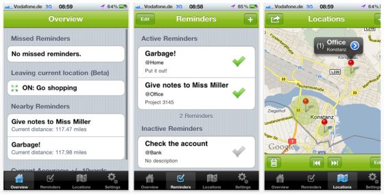 Die kurzzeitig von 1,59 Euro auf kostenlos gesetzte, deutschsprachige App Georeme von Julian Hirt gibt dir die Möglichkeit, Orte anzulegen und Erinnerungen an Aufgaben mit diesen Orten zu verbinden. Sobald man einen dieser Orte erreicht, werden die entsprechenden Erinnerungen, die an diesem Ort hinterlegt sind, angezeigt. Normalerweise werden Aufgaben, die man erledigen will ja mit einer Uhrzeit oder einem Datum verknüpft, bei Georeme geht es um die Orte, an denen man etwas erledigen möchte.