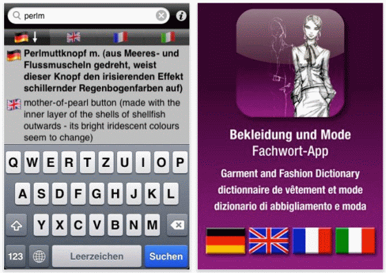 Wer in der Modewelt mitreden möchte, muss ihre Sprache verstehen. Die App kennt 30.000 Fachbegriffe. Sie nennt Modestile, kennt die wichtigsten Stoffe, stellt die verschiedenen Kleidungsteile vor, erklärt Größen und Maße, weiß um die Namen wichtiger Accessoires und erklärt Begriffe wie „Revers“, „Futter“, „Faltenwurf“, „Crinkle“, „Pareo“ oder „Vintagelook“.