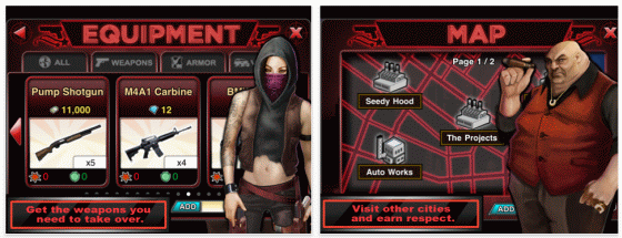 Das Grundspielprinzip hat sich jedoch nicht geändert. Du erledigst Missionen, um Geld, Erfahrung und geschenkte Waffen zu bekommen. Mit dem Geld rüstest Du Deinen Gangster mit Fahrzeugen, Angriffswaffen und Verteidigungs-Equipment aus und kannst diese erwähnten Gebäude kaufen, die Dir dann zusätzlich Geld einbringen. Durch gewonnene Erfahrung steigst Du im Level auf und bekommst mit jedem neuen Level wieder neue Waffen und Gebäude präsentiert. Diese solltest Du dann auch recht schnell kaufen, um gegenüber den anderen Spielern kraftmäßig nicht ins Hintertreffen zu kommen. Bei jedem Levelaufstieg gibt es drei Punkte, die Du auf verschiedene Fähigkeiten verteilen kannst: So kannst Du Deine Angriffs- oder Verteidungskraft stärken, mehr Missionen durchführen oder mehr Angriffe starten.