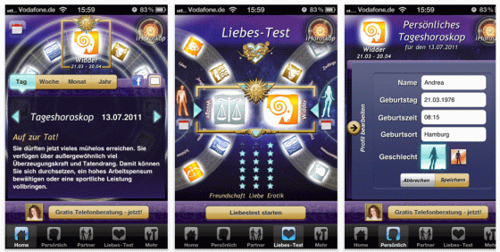 Nur dieses Wochende ist die neue Horoskop-App von freenet, iHoroskop Mobile, zur Einführung kostenlos im Download. Die Horoskop App bietet weit mehr als nur Tageshoroskope. Man kann mit ihr auch Wochen-, Monats- und Jahreshoroskope, individuelle Tageshoroskope, Liebes-Test, Partner- und Singleshoroskop erstellen. Und es ist ja völlig egal, ob man daran glauben möchte, unterhaltsam ist es auf jeden Fall.