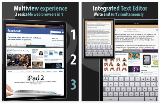 Die Universal App Knowtilus bietet weit mehr als ein einfacher Browser und ist insbesondere auf dem iPad ein gutes Tool für alles, was man im Web machen kann. So kann man sich drei Webseiten gleichzeitig anzeigen lassen. Man kann beim Surfen mit einem Basis-Texteditor Texte verfassen und speichern.