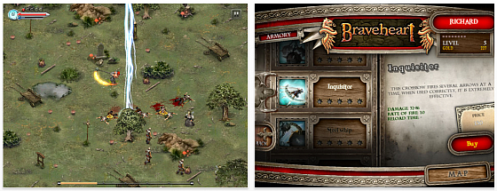 Links siehst Du das Spielfeld, wo Du Dich gegen die in Wellen angreifenden Gegner zur Wehr setzt. Rechts ein Blick in den Shop, wo Du neue Waffen und bessere Rüstung kaufen kannst.