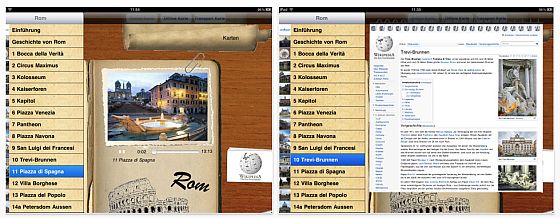 Die Reiseführer-Reihe von Giracitta ist etwas Besonderes: Es handelt sich dabei um einen Audio-Reiseführer mit vielen Informationen zu Land und Leuten. Die heute kostenlose Rom Version in deutscher Sprache für iPhone, iPod Touch und iPad umfasst 18 Kapitel, die man sich sehr gut anhören kann. Insgesamt enthält die App rund 3 Stunden Audio.