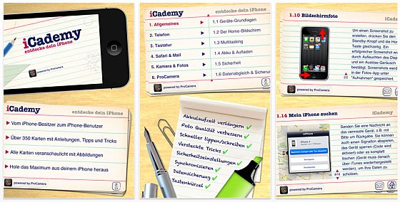 Hierfür bietet sich der iPhone-Tutor iCademy in Form einer App an. Auf diese Weise ist es möglich, bei unterwegs auftretenden Problemen sofort nach der passenden Lösung zu suchen. iCademy beinhaltet über 350 Tipps, Tricks und Anleitungen. Ein übersichtliches Inhaltsverzeichnis stellt die Themenbereiche vor, zu denen Tricks vorliegen, darunter etwa „Telefon“, „Tastatur“, „Kamera & Fotos“, „iPod Musik & Video“, „Problembehandlung“ oder „Spezial-Tipps“.