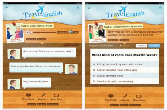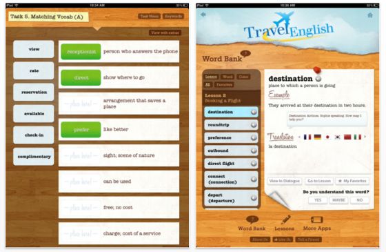 Mit Travelk English HD kannst Du DEine Englisch-Sprachkenntnisse schnell auffrischen, wenn Du ins Ausland reist. Links der Dialog - rechts eine Frage dazu.