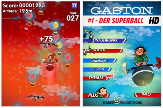 Im Spiel Gaston #1 – Der Superball und Gaston #1  HD – Der Superball (iPad Variante) hat Gaston eine Art Mega-Flummi erfunden und startet mit diesem in die Lüfte, als er den Ball seinen Kollegen vorstellen möchte, wie der kurze Einführungscomic zeigt.  Du steuerst den Ball mit Gaston darauf durch die Bewegung Deines Gerätes und versuchst, möglichst viele Luftballons zu treffen und so hoch wie möglich zu kommen.
