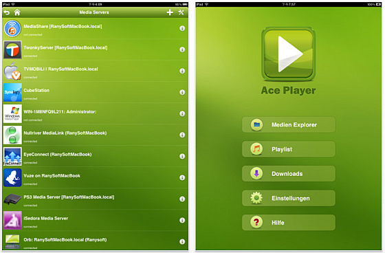 - AcePlayer läuft auf iPhone (ab 3GS), iPad und iPod Touch (ab 3. Generation) mit iOs 3.2 oder neuer
