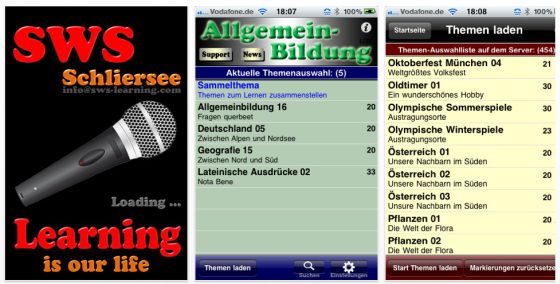 Über „Themen laden“ kannst Du Dir per Fingertipp ohne weitere Kosten beliebige Themen mit tausenden von Fragen und Antworten vom Server auf Dein Gerät laden. Alle Fragen und Antworten befinden sich in Form von Text und Sprachaufzeichnung unter alphabetisch geordneten Themennamen.