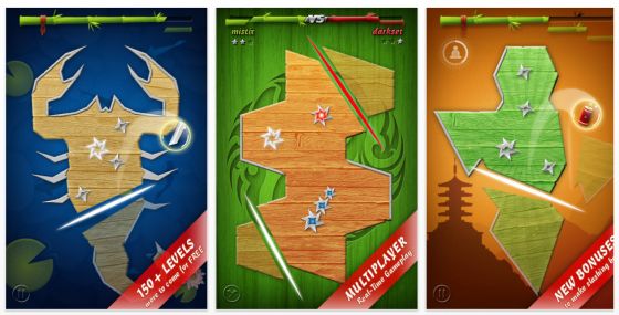 Im Spiel werden Dir 150 verschiedenartige Holzfelder gezeigt, die Du kleinschneiden sollst. Kleine Erschwernis dabei: Auf der Holzfläche fliegen einige Wurfsterne herum, die müssen immer zusammen bleiben. Wenn Du also ein Stückchen abschneidest, achte darauf, dass Du keinen Stern mit abschneidest, denn dann ist der Level verloren. Gewonnen ist ein Level, wenn Du die rote Markierung auf der Bambus-Stange oben erreicht hast. Das Spiel bringt die inzwischen übliche Level-Bewertung mit, jeder Level ist kurz und kann beliebig oft wiederholt werden.