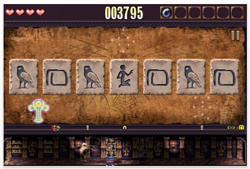 Es ist aber nicht so einfach, denn ab Level 3 wird der auf dem Display unten entlanglaufende Damian noch von einer Mumie verfolgt, er findet aber auch wertvolle Schätze und muss sich mit den Fallen herumschlagen, die Grabräuber abhalten sollen. Jedes Mal, wenn Du oben eine Kombination schaffst, bewegt sich Damian ein Stück weiter und bekommt neue Hieroglyphen-Steine, die oben erscheinen. Schaffst Du eine Serie von Kombinationen, bekommst Du einen Gegenstand, mit dem Du Fallen überleben kannst. Hast Du bei einer Falle keinen Gegenstand zum Schutz mehr, so verlierst Du ein Herz und vielleicht sogar Dein Leben, wodurch das Spiel dann endet. Deshalb ist es wichtig, auf die mehrfach Kombination zu achten, denn manchmal hast Du mehrere Wege, die Hieroglyphen zu kombinieren.