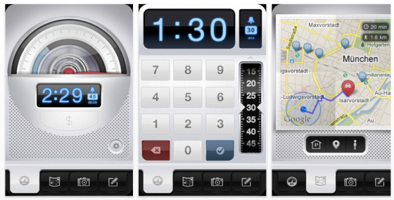 Der Park-Assistent Parkbud ist sehr hochwertig gestaltet: Links die Parkuhr, in der Mitte die Einstellung der Parkzeit und rechts die Kartenansicht, auf der man einen Pin setzen kann, wo das Fahrzeug abgestellt wurde. Da der aktuelle Standort per GPS angezeigt wird, muss man einfach nur den Pin dorthin setzen, wo der blaue Punkt angezeigt wird.