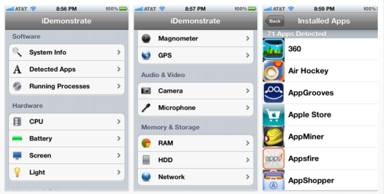 Mit der gerade kostenlosen Universal-App iDemonstrate kannst Du Dir alle Informationen über Dein Gerät anzeigen lassen. Aber die App kann noch mehr: Sie listet alle installierten Apps auf und gibt Dir Gelegenheit, auch Gyroscope, Beschleunigungssensor, Magnometer und GPS zu testen. Wenn Du möchtest, kannst Du mit der App auch die Empfindlichkeit des eingebauten Mikrophons testen und beide Kamerabilder anzeigen. Somit kann die App etwas mehr, als die bisher vorgestellten System-Tools.