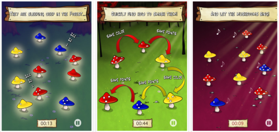 Du tippst in dem Spiel verschiedenfarbige Pilze mit Punkten darauf an. Wie bei MauMau tippst Du die Pilze einer Farbe und kannst nur zu einer anderen Farbe wechseln, wenn die Punktzahl auf dem Pilz übereinstimmt. Wenn Du das vorgegebene Ziel erreichst, fangen die stets nachwachsenden Pilze an, bei jedem Tipp einen Ton zu spielen – und viele Töne ergeben dann ein Musikstück. Mit dem Tippen spielst Du also Musikstücke nach. Das gelingt zunächst ganz gut, aber mit der Zeit kommen mehr Farben dazu und Du musst schnell tippen, damit Du keine Strafpunkte bekommst.