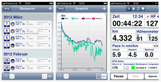 iBody und iBody HD (für das iPad) ist die neue innovative Applikation in Sachen Gesundheit und Fitness mit deutschsprachiger Oberfläche. Dokumentiere all Deine wichtigen Daten von Gewicht, Körperfett, Wasser- und Muskelanteil bis hin zu Cholesterinspiegel, Körpertemperatur, Laktat, Blutdruck, Puls und vieles mehr. Alle Eingabewerte können ein- oder ausgeblendet werden, so dass Du iBody ganz individuell auf Deine Bedürfnisse einstellen kannst.