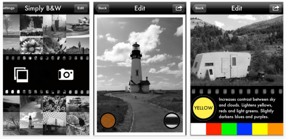 Die App unterstützt Dich bei der Umwandlung mit sechs Filtern, die einzelne Farben bei der Umwandlung stärker durchkommen lassen. Du kannst Helligkeit und Kontrast einstellen – und falls Du es brauchst auch eine Körnung. Dazu gibt es einen schwarzen und einen weißen Rahmen und eine einstellbare Vignette.