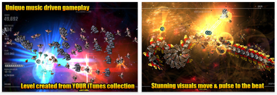 Heute ist mit Beat Hazard Ultra eine außergewöhnliche Musik-Spiel-App kostenlos, die Ihr Euch mal ansehen solltet. Aus der Musik, die auf Eurem iPhone oder iPad gespeichert ist, wird ein Spiel gemacht, bei dem Ihr im Stile eines Arcade Shooters im Weltall unterwegs seid. Ihr steuert Euer Raumschiff durch Horden von Gegnern, sammelt Boni ein und passt möglichst auf, lange durchzuhalten. Die Boni sind Multiplikatoren und neue Kanonen mit mehr Feuerkraft.Das Spiel ist für alle Arcade-Freunde sicher ein besonderes Vergnügen.