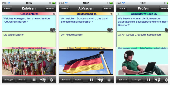 Mit der Funktion „Zuhören“ werden Dir die Fragen und Antworten in zufälliger Reihenfolge angezeigt und vorgelesen. Da in dieser Lernfunktion keinerlei Aktion vom Anwender nötig ist, kann man diese Funktion auch sehr gut über das Autoradio verwenden (Handy-Audioausgang mit der Radio-Eingangsbuchse AUX verbinden), oder die App in der Bahn oder beim Joggen laufen lassen.
