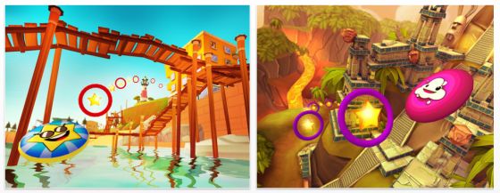 Wenn man sich heute beide Versionen lädt, hat man 175 Level mit sehr kreativen „Spielplätzen“, mit herausfordernden Aufgaben und kniffligen Strecken. Zum Anfang sind die Level natürlich sehr einfach, aber die sind mehr zum Lernen der Steuerung gedacht. Um genug Coins zum Freischalten weiterer Level zu bekommen, dürft Ihr keine Ringe und Sterne oder Münzen auslassen. Am Ende jedes Levels wird zusammengezählt und dann bekommt Ihr vielleicht sogar eine Gold-Medaille. Man muss sich erst etwas daran gewöhnen, wie man das Frisbee steuert, aber das geht dann sehr präzise durch die Bewegung Eures Gerätes. Dennoch ist es nicht einfach, schon weil die Frisbee-Flugbahn doch sehr an eine Achterbahn erinnert, da geht es hoch und runter, rechts und links in Kurven, durch Luftströmungen und Tunnel und noch viel mehr. Wenn Du gut bist, kannst Du auch spezielle Frisbees freischalten, die dann besser fliegen.