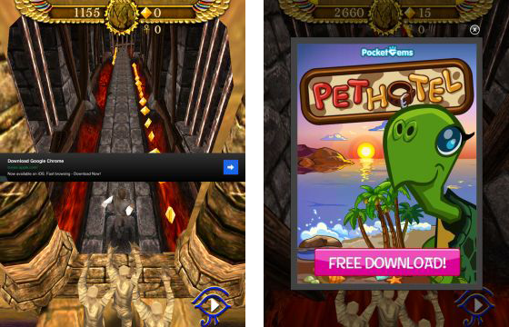 Diese beiden Screenshots habe ich während des Spiels gemacht – hier sieht man gut, wie man mit der Platzierung von Werbung das Spiel komplett unspielbar machen kann.