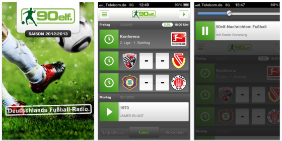 Mit der kurzfristig kostenlosen Fußball-App 90elf für iPhone und iPod Touch hast Du alle Spiele der 1. und 2. Bundesliga, DFB-Pokal sowie ausgewählte Spiele der Champions League und Europa League – live, kostenlos und in voller Länge für die gesamte Saison 2012/2013. 90elf ist Deutschlands erstes Fussball-Radio und offizieller Rechtepartner der Deutschen Fußball Liga (DFL).