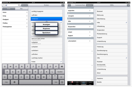 Was ist ein Synonym? Wenn zwei oder mehr Wörter in einem bestimmten Kontext die gleiche Bedeutung haben, sind sie Synonyme. Der Name ist hier Programm: Synonyme bietet eine Suche nach sinnverwandten Wörtern. Der Wortschatz kann durchsucht und gefiltert werden. Bereits bei der Eingabe erscheinen Suchvorschläge. Die nachgeschlagenen Wörter werden in einem Verlauf gespeichert und können zusätzlich als Lesezeichen hinterlegt werden. Jedes Wort kann in den Zwischenspeicher kopiert werden, um es in anderen Apps zu verwenden.