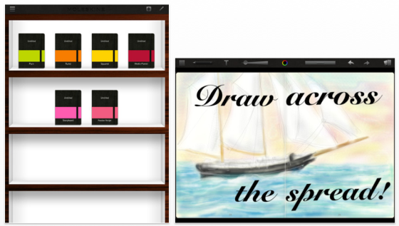 Links sieht man die Notizbuchübersicht, rechts ein Beispiel für eine Handzeichnung, die über beide Seiten geht. Moleskine Journal kommt hochwertig gestaltet, hat aber noch Verbesserungsbedarf.