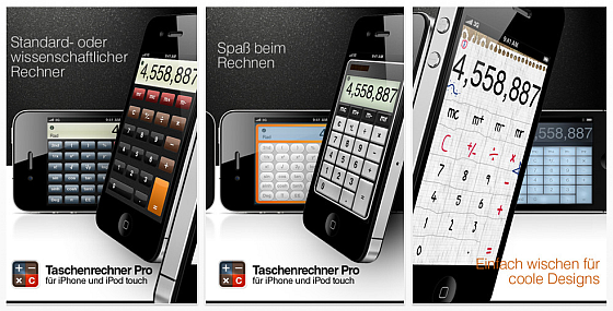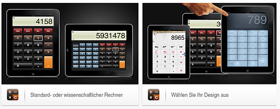 Die App bietet in der Downloadversion drei verschiedene Designs, die man durch Wischen auf dem Display anzeigen lassen kann. Man kann sogar während des Rechnens das Design verändern. Wem das nicht reicht, der kann über einen In-App-Kauf noch weitere Designs dazukaufen.