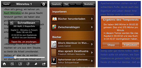 Wichtig ist noch, dass man natürlich auch seine Lesegeschwindigkeit testen kann. Hier liest man einfach ein paar Seiten und tippt zum Start und zum Ende des Tests auf den Bildschirm. Das Programm zeigt dann an, wieviel Wörter man in welcher Zeit gelesen hat und berechnet daraus eine Vorhersage für das laufende Kapitel und das gesamte Buch.