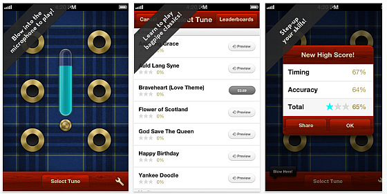 Die Bagpipes (in deutsch der Dudelsack) sind ein klassisches Instrument, dass oft in Schlachten eingesetzt wurde, um die Gegner zu erschrecken. Doch auch in der schottischen Musik spielt der Dudelsack noch immer eine Rolle. Mit der heute kostenlosen App Air Pipes – Bagpipes for iPhone kannst Du Dein iPhone und Deinen iPod Touch mal eben zum Dudelsack machen. Ich habe es probiert – und das Ergebnis kann sich hören lassen. Wie beim echten Dudelsack muss man zunächst in das Gerät pusten, so dass der Druck aufgebaut wird, der die Pfeifen dann zum Erklingen bringt. Hier bläst man in das Mikrophon, bis die mittig angeordnete Druckanzeige voll ist.