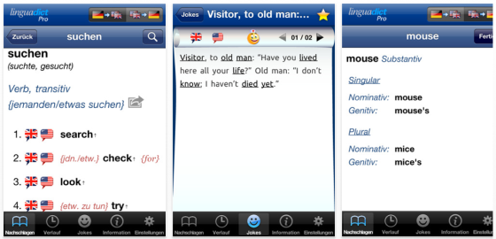Bis morgen Nacht gibt es eine gute Möglichkeit, drei exzellente Wörterbücher zum halben Preis auf das iPhone, den iPod oder das iPad zu laden: Linguatec hat die Preise für das Spanisch-Wörterbuch, das Wörterbuch Deutsch und das English-Dictionary auf 79 Cent gesetzt.