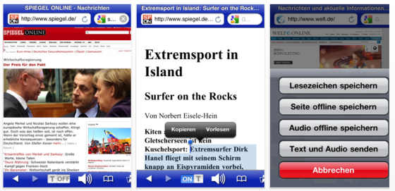 Voice Reader WebAuch der VoiceReader Web ist bis Sonntagnacht reduziert: Mit diesem Programm kannst Du Dir auf iPhone und iPad Webseiten online oder offline vorlesen lassen – in 21 Sprachen und mit 32 Stimmen. Gerade bei dem doch recht kleinen Display des iPhone und iPod Touch deutlich ermüdungsfreier. Die App speichert auf Wunsch die Webseiten offline und liest sie bei Bedarf vor, so kann man auch im Ausland – wo man vielleicht keinen Netzzugang hat, auf Webseiten zugreifen.