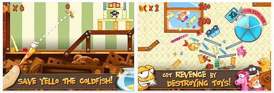 Naja, die Art des Zurückbringens ist nicht so ganz ohne: Du musst nämlich den Fisch am Schwanz packen und dann ziehen, bis er wie vom Katapult geschleudert davonfliegt. Nun ist Yello ja alles andere, als ein fliegender Fisch und so geht die Landung oft nicht so aus, wie man es erwarten würde. Im Gegensatz zu anderen Physikspielen geht es bei Saving Yello nicht allein darum, mit möglichst wenig Schüssen Yello ins Glas zurückzuschleudern, sondern auch darum, dabei möglichst viel Spielzeug zu zerstören. Eine kleine Racher sozusagen. Da explodiert dann so Einiges und manchmal kann es gut sein, einen Extraschuss zu machen, um mehr Spielzeug zu treffen. Kurz: Über 50 Level in drei Welten gibt es jede Menge zu erleben – und Spaß macht es auch.